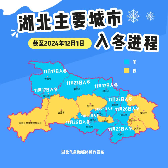 根据前期实况,截至12月1日,湖北省已经有超过一半以上的主要城市进入了冬季,其中十堰、神农架、随州11月17日就率先入冬。上周寒潮天气过后,江汉平原南部和东部地区也相继入冬,武汉11月26日入冬。虽然还有部分城市目前的数据暂时没有达到入冬标准,如恩施、黄冈、荆门等,但因为入冬具体日期需要根据一段时间的实况进行反推,目前各地都正在“走流程”。预计在本周两次冷空气影响下,湖北全省入冬基本没有悬念。不过跟常年相比,今年入冬时间还是略有偏晚。